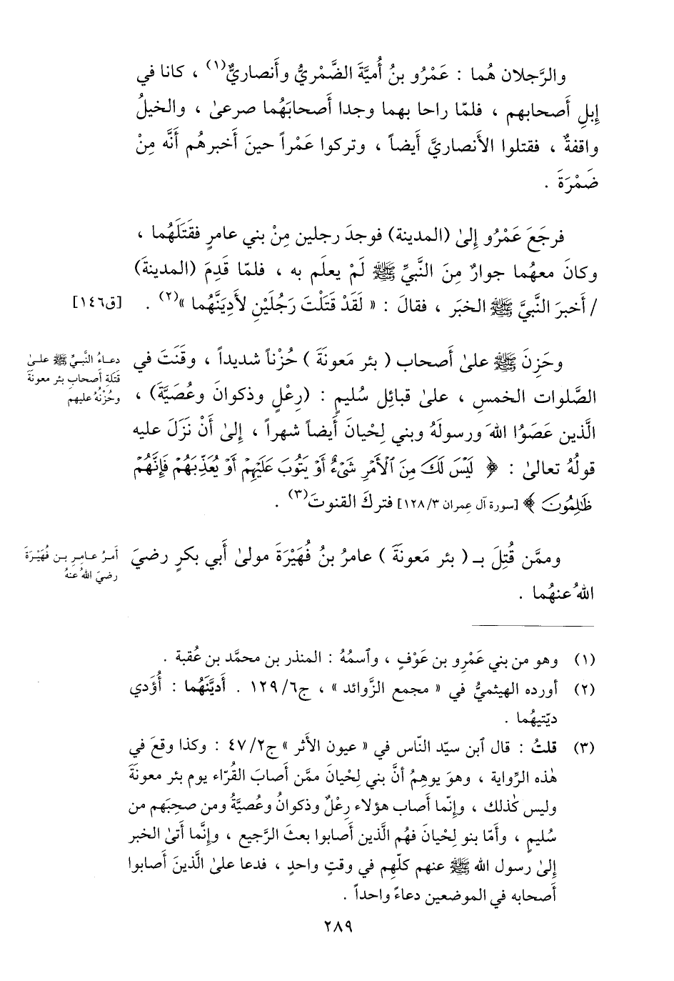 (3) قلت: قال ابن سيّد النّاس في «عيون الأثر» ج 2/ 47: وكذا وقع في هذه الرّواية، وهو يوهم أنّ بني لحيان ممّن أصاب القرّاء يوم بئر معونة وليس كذلك، وإنّما أصاب هؤلاء رعل وذكوان وعصيّة ومن صحبهم من سليم، وأمّا بنو لحيان فهم الّذين أصابوا بعث الرّجيع، وإنّما أتى الخبر إلى رسول الله صلى الله عليه وسلم عنهم كلّهم في وقت واحد، فدعا على الّذين أصابوا أصحابه في الموضعين دعاء واحدا.