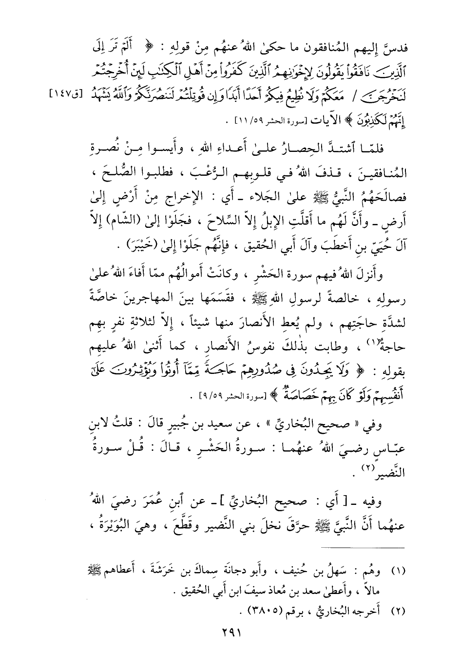 وأنزل الله فيهم سورة الحشر، وكانت أموالهم ممّا أفاء الله على رسوله، خالصة لرسول الله صلى الله عليه وسلم، فقسمها بين المهاجرين خاصّة لشدّة حاجتهم، ولم يعط الأنصار منها شيئا، إلّا لثلاثة نفر بهم حاجة «1» ، وطابت بذلك نفوس الأنصار، كما أثنى الله عليهم بقوله: وَلا يَجِدُونَ فِي صُدُورِهِمْ حاجَةً مِمَّا أُوتُوا وَيُؤْثِرُونَ عَلى أَنْفُسِهِمْ وَلَوْ كانَ بِهِمْ خَصاصَةٌ [سورة الحشر 59/ 9] .