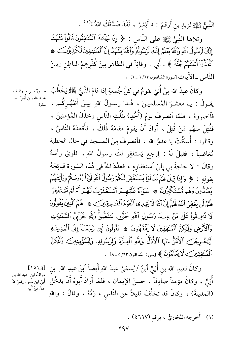 وكان عبد الله بن أبيّ يقوم في كلّ جمعة إذا قام النّبيّ صلى الله عليه وسلم يخطب يقول: يا معشر المسلمين، هذا رسول الله بين أظهركم، فانصروه، فلمّا انصرف يوم (أحد) بثلث النّاس وخذل المؤمنين، فقتل منهم من قتل، أراد أن يقوم مقامه ذلك، فأقعده النّاس، وقالوا: أسكت يا عدوّ الله، فانصرف من المسجد في حال الخطبة مغاضبا، فقيل له: ارجع يستغفر لك رسول الله، فلوى رأسه وقال: لا حاجة بي إلى استغفاره، فعدّد الله في هذه السّورة قبائحه بقوله: وَإِذا قِيلَ لَهُمْ تَعالَوْا يَسْتَغْفِرْ لَكُمْ رَسُولُ اللَّهِ لَوَّوْا رُؤُسَهُمْ وَرَأَيْتَهُمْ يَصُدُّونَ وَهُمْ مُسْتَكْبِرُونَ. سَواءٌ عَلَيْهِمْ أَسْتَغْفَرْتَ لَهُمْ أَمْ لَمْ تَسْتَغْفِرْ لَهُمْ لَنْ يَغْفِرَ اللَّهُ لَهُمْ إِنَّ اللَّهَ لا يَهْدِي الْقَوْمَ الْفاسِقِينَ. هُمُ الَّذِينَ يَقُولُونَ لا تُنْفِقُوا عَلى مَنْ عِنْدَ رَسُولِ اللَّهِ حَتَّى يَنْفَضُّوا وَلِلَّهِ خَزائِنُ السَّماواتِ وَالْأَرْضِ وَلكِنَّ الْمُنافِقِينَ لا يَفْقَهُونَ. يَقُولُونَ لَئِنْ رَجَعْنا إِلَى الْمَدِينَةِ لَيُخْرِجَنَّ الْأَعَزُّ مِنْهَا الْأَذَلَّ وَلِلَّهِ الْعِزَّةُ وَلِرَسُولِهِ وَلِلْمُؤْمِنِينَ وَلكِنَّ الْمُنافِقِينَ لا يَعْلَمُونَ [سورة المنافقون 63/ 5- 8] .