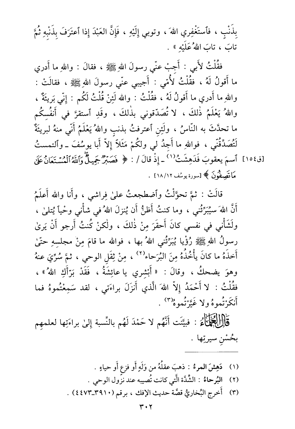 والله ما أدري ما أقول له، فقلت: والله لئن قلت لكم: إنّي بريئة- والله يعلم ذلك- لا تصدّقوني بذلك، وقد استقرّ في أنفسكم ما تحدّث به النّاس، ولئن اعترفت بذنب والله يعلم أنّي منه لبريئة لتصدّقنّي، فو الله ما أجد لي ولكم مثلا إلّا أبا يوسف- والتمست اسم يعقوب فدهشت «1» - إذ قال/: فَصَبْرٌ جَمِيلٌ وَاللَّهُ الْمُسْتَعانُ عَلى ما تَصِفُونَ [سورة يوسف 12/ 18] .