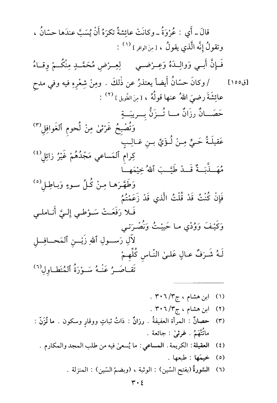 قال- أي: عروة- وكانت عائشة تكره أن يسبّ عندها حسّان، وتقول إنّه الّذي يقول، [من الوافر] «1» :