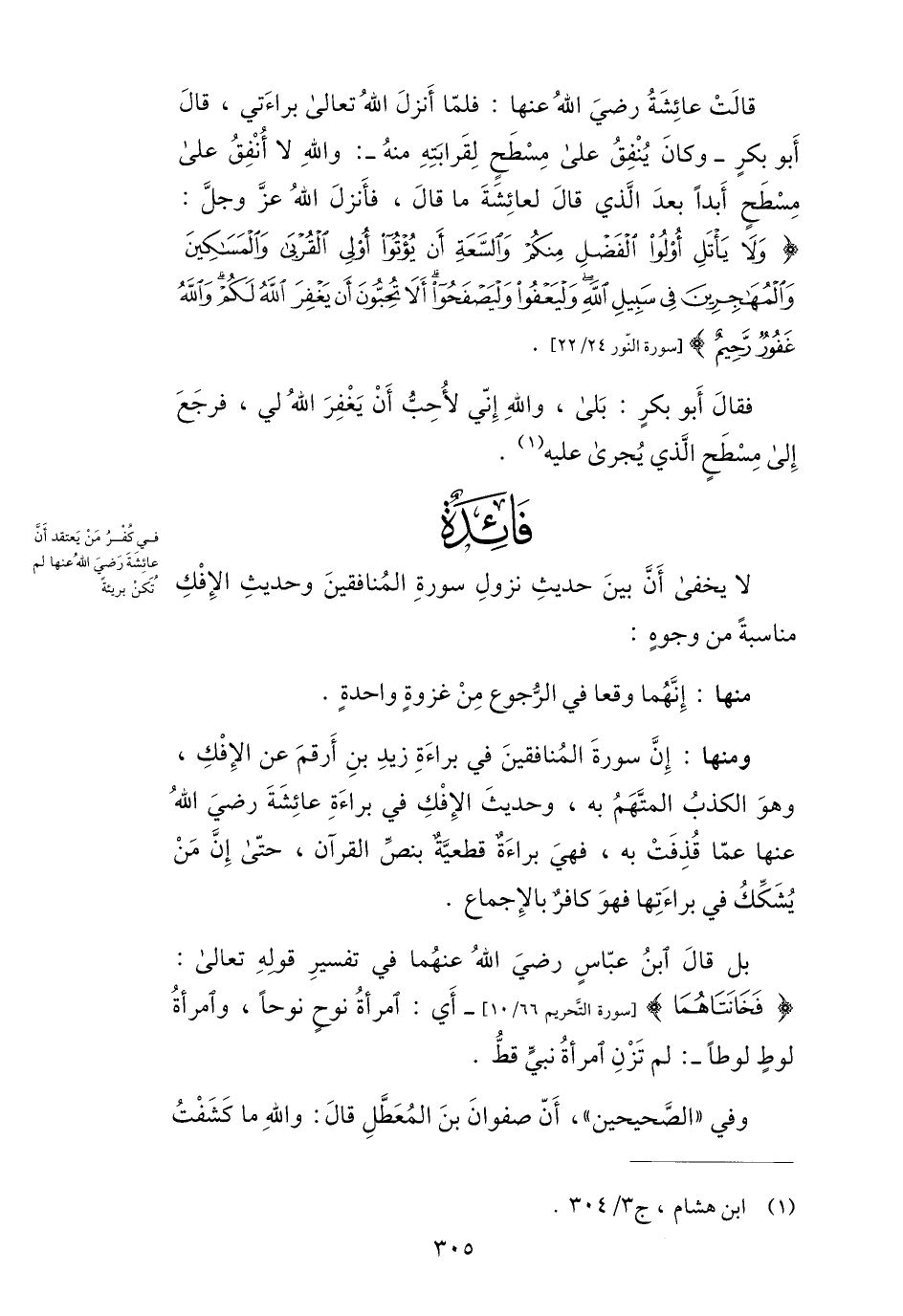 ومنها: إنّ سورة المنافقين في براءة زيد بن أرقم عن الإفك، وهو الكذب المتّهم به، وحديث الإفك في براءة عائشة رضي الله عنها عمّا قذفت به، فهي براءة قطعيّة بنصّ القرآن، حتّى إنّ من يشكّك في براءتها فهو كافر بالإجماع.