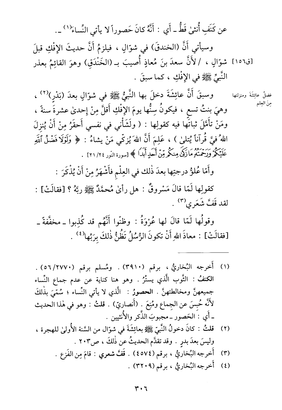 (2) قلت: كان دخول النّبيّ صلى الله عليه وسلم بعائشة في شوّال من السّنة الأولى للهجرة، وليس بعد بدر. وقد تقدّم الحديث عن ذلك، ص 203.