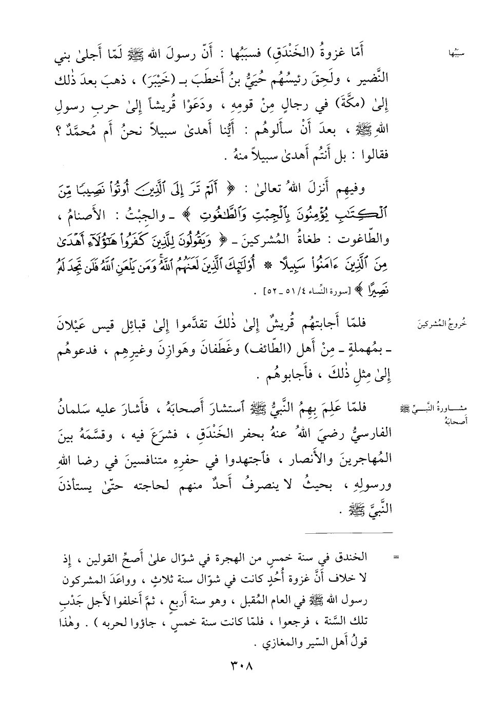 أمّا غزوة (الخندق) فسببها: أنّ رسول الله صلى الله عليه وسلم لمّا أجلى بني النّضير، ولحق رئيسهم حييّ بن أخطب ب (خيبر) ، ذهب بعد ذلك إلى (مكّة) في رجال من قومه، ودعوا قريشا إلى حرب رسول الله صلى الله عليه وسلم، بعد أن سألوهم: أيّنا أهدى سبيلا نحن أم محمّد؟