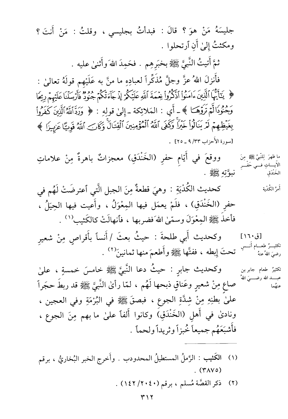 يا أَيُّهَا الَّذِينَ آمَنُوا اذْكُرُوا نِعْمَةَ اللَّهِ عَلَيْكُمْ إِذْ جاءَتْكُمْ جُنُودٌ فَأَرْسَلْنا عَلَيْهِمْ رِيحاً وَجُنُوداً لَمْ تَرَوْها- أي: الملائكة- إلى قوله: وَرَدَّ اللَّهُ الَّذِينَ كَفَرُوا بِغَيْظِهِمْ لَمْ يَنالُوا خَيْراً وَكَفَى اللَّهُ الْمُؤْمِنِينَ الْقِتالَ وَكانَ اللَّهُ قَوِيًّا عَزِيزاً [سورة الأحزاب 33/ 9- 25] .