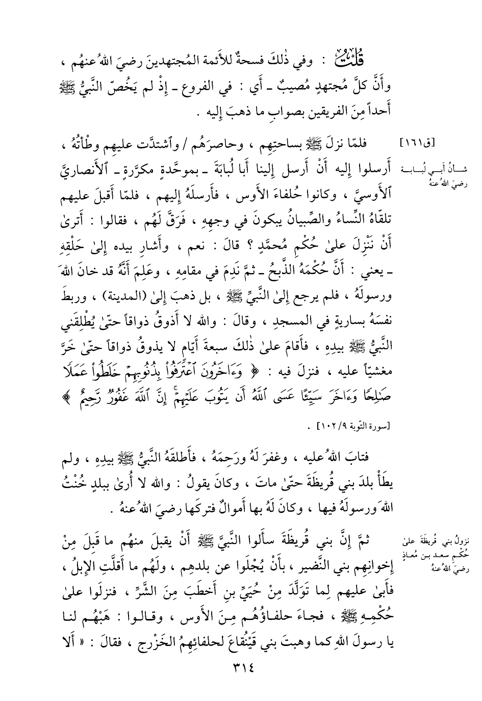فلمّا نزل صلى الله عليه وسلم بساحتهم، وحاصرهم/ واشتدّت عليهم وطأته، أرسلوا إليه أن أرسل إلينا أبا لبابة- بموحّدة مكرّرة- الأنصاريّ الأوسيّ، وكانوا حلفاء الأوس، فأرسله إليهم، فلمّا أقبل عليهم تلقّاه النّساء والصّبيان يبكون في وجهه، فرقّ لهم، فقالوا: أترى أن ننزل على حكم محمّد؟ قال: نعم، وأشار بيده إلى حلقه- يعني: أنّ حكمه الذّبح- ثمّ ندم في مقامه، وعلم أنّه قد خان الله ورسوله، فلم يرجع إلى النّبيّ صلى الله عليه وسلم، بل ذهب إلى (المدينة) ، وربط نفسه بسارية في المسجد، وقال: والله لا أذوق ذواقا حتّى يطلقني النّبيّ صلى الله عليه وسلم بيده، فأقام على ذلك سبعة أيّام لا يذوق ذواقا حتّى خرّ مغشيّا عليه، فنزل فيه: وَآخَرُونَ اعْتَرَفُوا بِذُنُوبِهِمْ خَلَطُوا عَمَلًا صالِحاً وَآخَرَ سَيِّئاً عَسَى اللَّهُ أَنْ يَتُوبَ عَلَيْهِمْ إِنَّ اللَّهَ غَفُورٌ رَحِيمٌ [سورة التّوبة 9/ 102] .