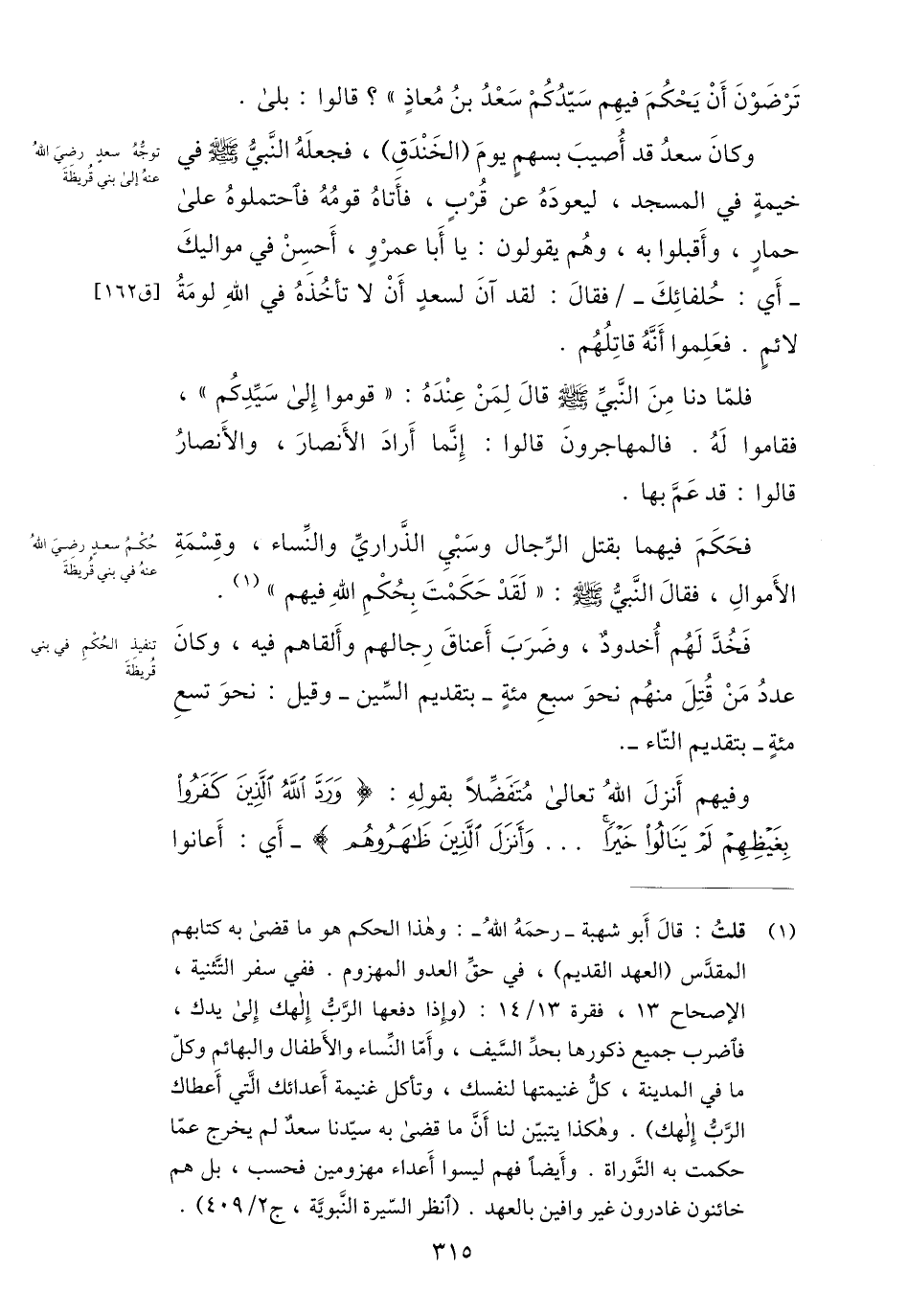 (1) قلت: قال أبو شهبة- رحمه الله-: وهذا الحكم هو ما قضى به كتابهم المقدّس (العهد القديم) ، في حقّ العدو المهزوم. ففي سفر التّثنية، الإصحاح 13، فقرة 13/ 14: (وإذا دفعها الرّبّ إلهك إلى يدك، فاضرب جميع ذكورها بحدّ السّيف، وأمّا النّساء والأطفال والبهائم وكلّ ما في المدينة، كلّ غنيمتها لنفسك، وتأكل غنيمة أعدائك الّتي أعطاك الرّبّ إلهك) . وهكذا يتبيّن لنا أنّ ما قضى به سيّدنا سعد لم يخرج عمّا حكمت به التّوراة. وأيضا فهم ليسوا أعداء مهزومين فحسب، بل هم خائنون غادرون غير وافين بالعهد. (انظر السّيرة النّبويّة، ج 2/ 409) .
