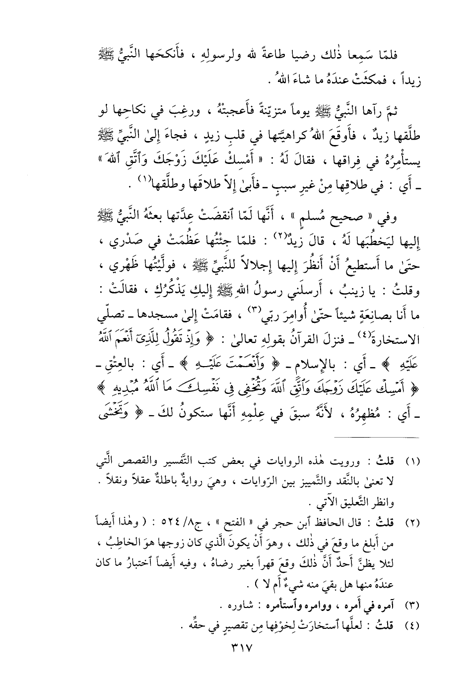 ما أنا بصانعة شيئا حتّى أوامر ربّي «3» ، فقامت إلى مسجدها- تصلّي الاستخارة «4» - فنزل القرآن بقوله تعالى: وَإِذْ تَقُولُ لِلَّذِي أَنْعَمَ اللَّهُ عَلَيْهِ- أي: بالإسلام- وَأَنْعَمْتَ عَلَيْهِ- أي: بالعتق- أَمْسِكْ عَلَيْكَ زَوْجَكَ وَاتَّقِ اللَّهَ وَتُخْفِي فِي نَفْسِكَ مَا اللَّهُ مُبْدِيهِ- أي: مظهره، لأنّه سبق في علمه أنّها ستكون لك- وَتَخْشَى