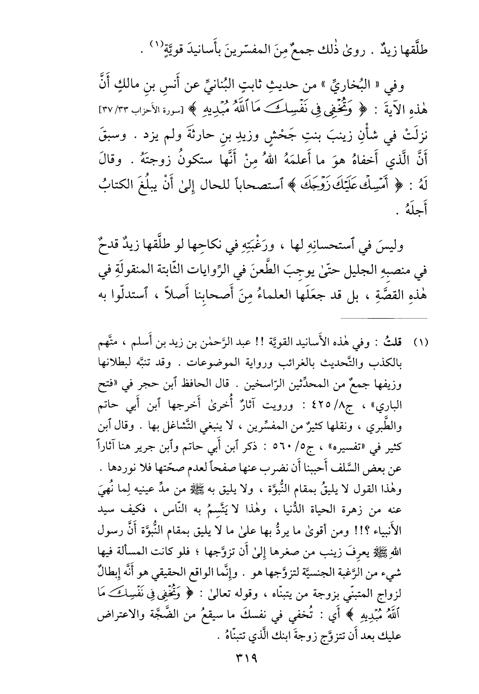 (1) قلت: وفي هذه الأسانيد القويّة!! عبد الرّحمن بن زيد بن أسلم، متّهم بالكذب والتّحديث بالغرائب ورواية الموضوعات. وقد تنبّه لبطلانها وزيفها جمع من المحدّثين الرّاسخين. قال الحافظ ابن حجر في «فتح الباري» ، ج 8/ 425: ورويت آثار أخرى أخرجها ابن أبي حاتم والطّبري، ونقلها كثير من المفسّرين، لا ينبغي التّشاغل بها. وقال ابن كثير في «تفسيره» ، ج 5/ 560: ذكر ابن أبي حاتم وابن جرير هنا آثارا عن بعض السّلف أحببنا أن نضرب عنها صفحا لعدم صحّتها فلا نوردها. وهذا القول لا يليق بمقام النّبوّة، ولا يليق به صلى الله عليه وسلم من مدّ عينيه لما نهي عنه من زهرة الحياة الدّنيا، وهذا لا يتّسم به النّاس، فكيف سيد الأنبياء؟!! ومن أقوى ما يردّ بها على ما لا يليق بمقام النّبوّة أنّ رسول الله صلى الله عليه وسلم يعرف زينب من صغرها إلى أن تزوّجها؛ فلو كانت المسألة فيها شيء من الرّغبة الجنسيّة لتزوّجها هو. وإنّما الواقع الحقيقي هو أنّه إبطال لزواج المتبنّي بزوجة من يتبنّاه، وقوله تعالى: وَتُخْفِي فِي نَفْسِكَ مَا اللَّهُ مُبْدِيهِ أي: تخفي في نفسك ما سيقع من الضّجّة والاعتراض عليك بعد أن تتزوّج زوجة ابنك الّذي تتبنّاه.