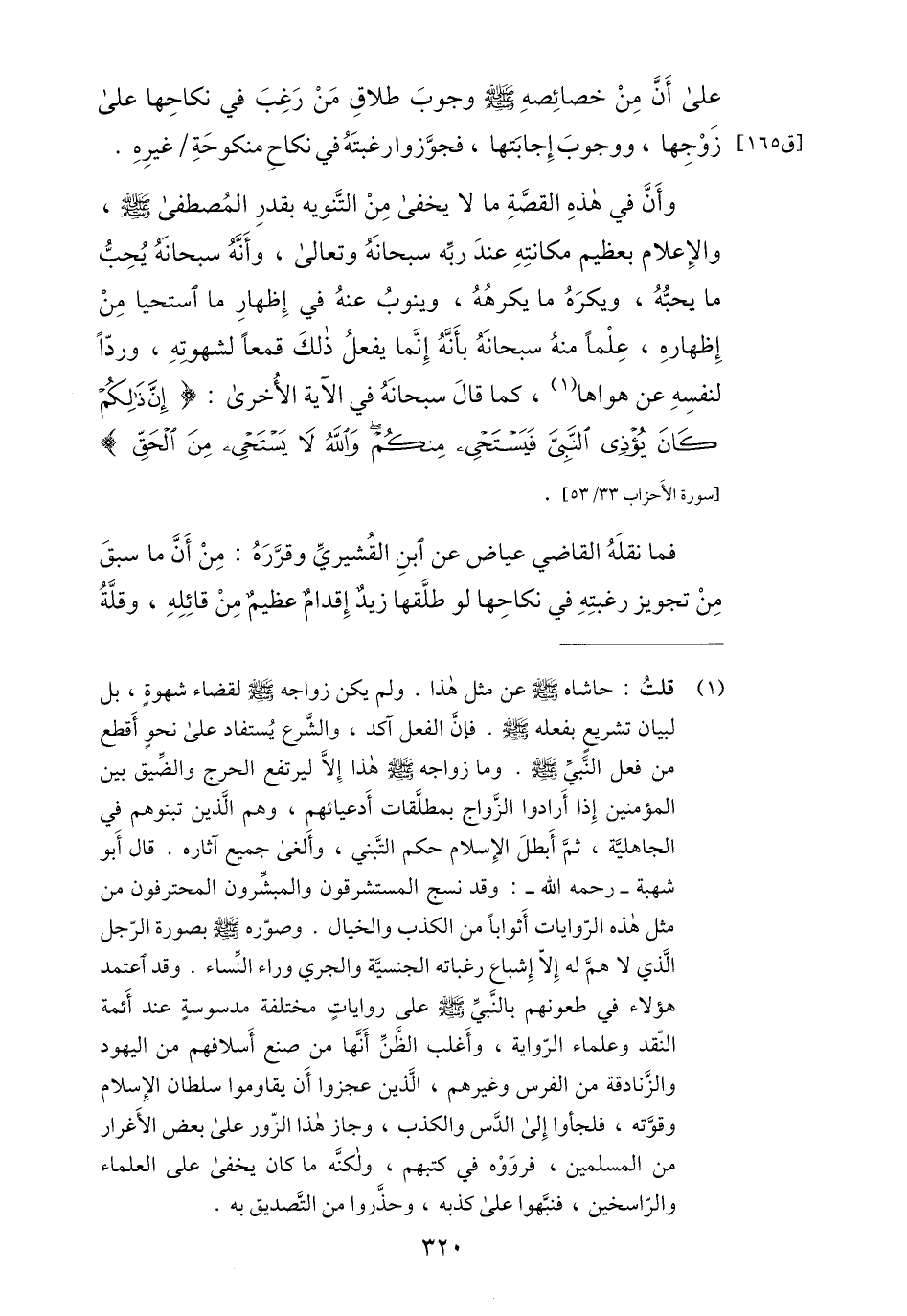 (1) قلت: حاشاه صلى الله عليه وسلم عن مثل هذا. ولم يكن زواجه صلى الله عليه وسلم لقضاء شهوة، بل لبيان تشريع بفعله صلى الله عليه وسلم. فإنّ الفعل آكد، والشّرع يستفاد على نحو أقطع من فعل النّبيّ صلى الله عليه وسلم. وما زواجه صلى الله عليه وسلم هذا إلّا ليرتفع الحرج والضّيق بين المؤمنين إذا أرادوا الزّواج بمطلّقات أدعيائهم، وهم الّذين تبنوهم في الجاهليّة، ثمّ أبطل الإسلام حكم التّبني، وألغى جميع آثاره. قال أبو شهبة- رحمه الله-: وقد نسج المستشرقون والمبشّرون المحترفون من مثل هذه الرّوايات أثوابا من الكذب والخيال. وصوّروه صلى الله عليه وسلم بصورة الرّجل الّذي لا همّ له إلّا إشباع رغباته الجنسيّة والجري وراء النّساء. وقد اعتمد هؤلاء في طعونهم بالنّبيّ صلى الله عليه وسلم على روايات مختلفة مدسوسة عند أئمة النّقد وعلماء الرّواية، وأغلب الظّنّ أنّها من صنع أسلافهم من اليهود والزّنادقة من الفرس وغيرهم، الّذين عجزوا أن يقاوموا سلطان الإسلام وقوّته، فلجأوا إلى الدّس والكذب، وجاز هذا الزّور على بعض الأغرار من المسلمين، فرووه في كتبهم، ولكنّه ما كان يخفى على العلماء والرّاسخين، فنبّهوا على كذبه، وحذّروا من التّصديق به.