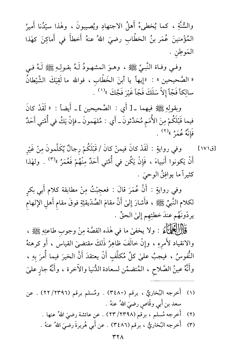 وبقوله صلى الله عليه وسلم فيهما-[أي: الصّحيحين]- أيضا: «لقد كان فيما قبلكم من الأمم محدّثون- أي: ملهمون- فإن يك في أمّتي أحد فإنّه عمر» «2» .