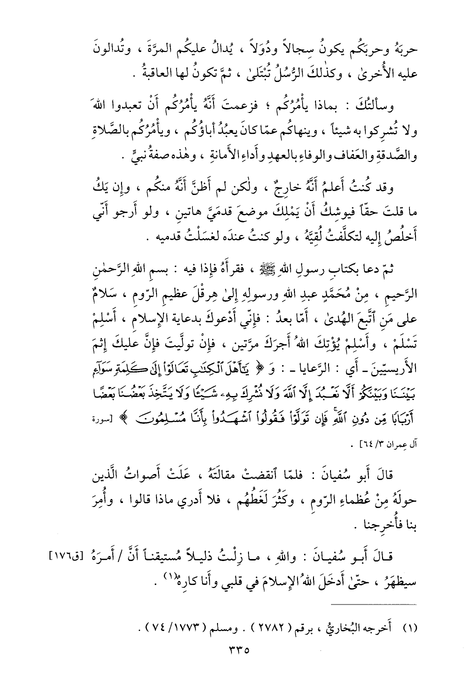 ثمّ دعا بكتاب رسول الله صلى الله عليه وسلم، فقرأه فإذا فيه: بسم الله الرحمن الرحيم، من محمّد عبد الله ورسوله إلى هرقل عظيم الرّوم، سلام على من اتّبع الهدى، أمّا بعد: فإنّي أدعوك بدعاية الإسلام، أسلم تسلم، وأسلم يؤتك الله أجرك مرّتين، فإن تولّيت فإنّ عليك إثم الأريسيّين- أي: الرّعايا-: ويا أَهْلَ الْكِتابِ تَعالَوْا إِلى كَلِمَةٍ سَواءٍ بَيْنَنا وَبَيْنَكُمْ أَلَّا نَعْبُدَ إِلَّا اللَّهَ وَلا نُشْرِكَ بِهِ شَيْئاً وَلا يَتَّخِذَ بَعْضُنا بَعْضاً أَرْباباً مِنْ دُونِ اللَّهِ فَإِنْ تَوَلَّوْا فَقُولُوا اشْهَدُوا بِأَنَّا مُسْلِمُونَ [سورة آل عمران 3/ 64] .