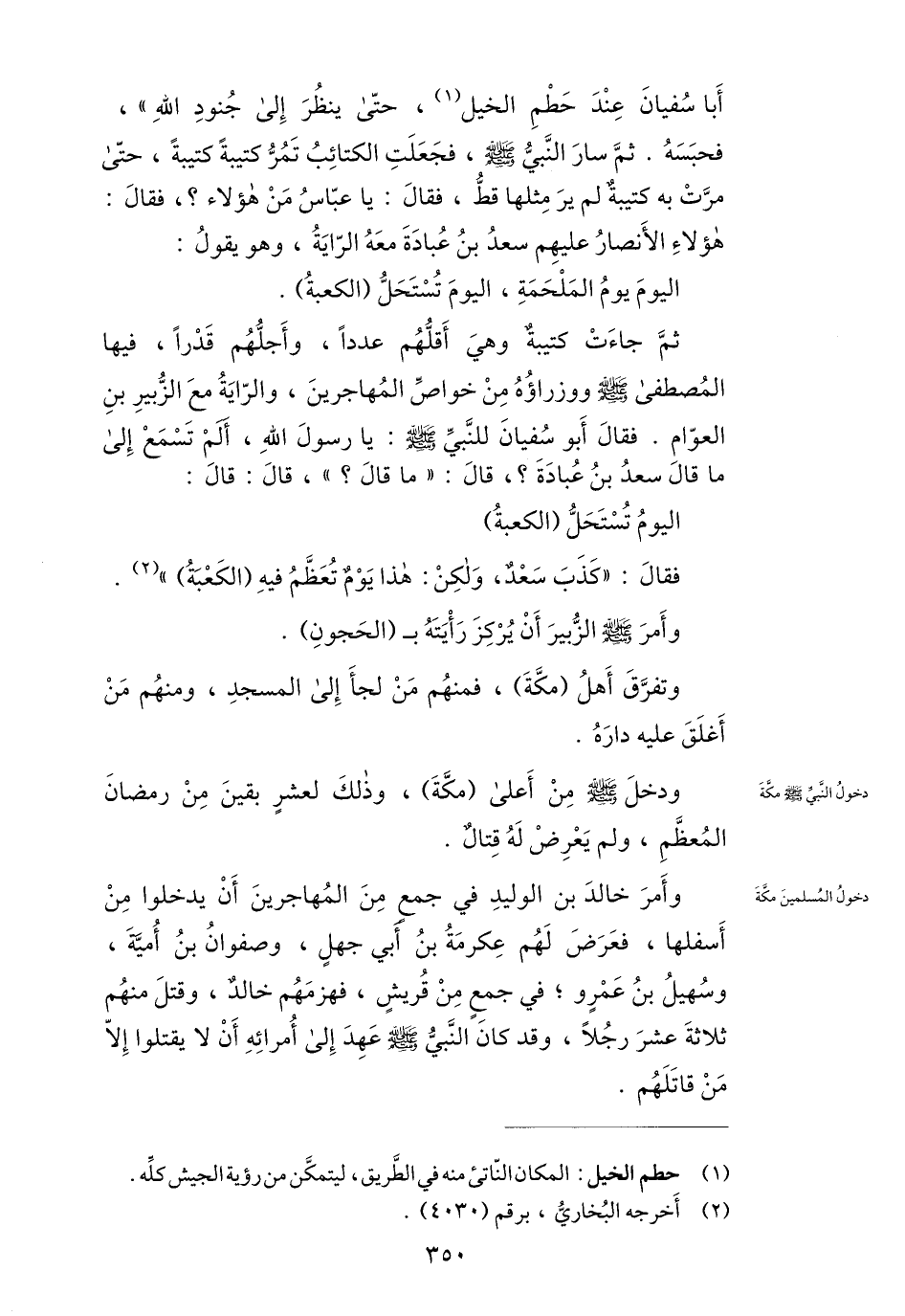 ثمّ جاءت كتيبة وهي أقلّهم عددا، وأجلّهم قدرا، فيها المصطفى صلى الله عليه وسلم ووزراؤه من خواصّ المهاجرين، والرّاية مع الزّبير بن العوّام. فقال أبو سفيان للنّبيّ صلى الله عليه وسلم: يا رسول الله، ألم تسمع إلى ما قال سعد بن عبادة؟، قال: «ما قال؟» ، قال: قال: اليوم تستحلّ (الكعبة) .