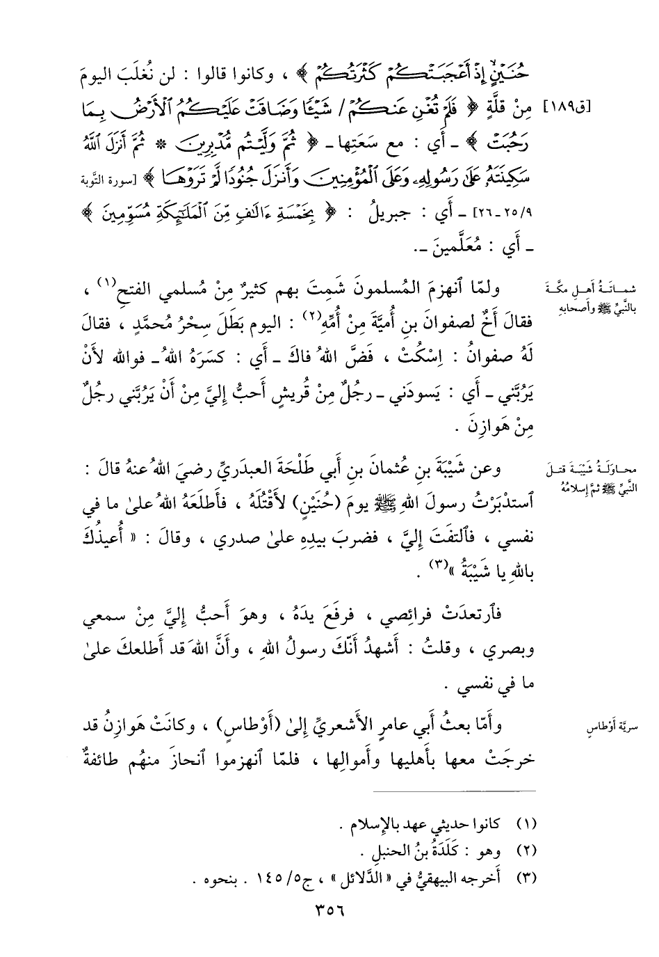 ولمّا انهزم المسلمون شمت بهم كثير من مسلمي الفتح «1» ، فقال أخ لصفوان بن أميّة من أمّه «2» : اليوم بطل سحر محمّد، فقال له صفوان: اسكت، فضّ الله فاك- أي: كسره الله- فو الله لأن يربّني- أي: يسودني- رجل من قريش أحبّ إليّ من أن يربّني رجل من هوازن.