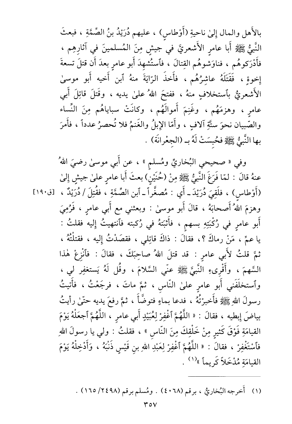 وفي «صحيحي البخاريّ ومسلم» ، عن أبي موسى رضي الله عنه قال: لمّا فرغ النّبيّ صلى الله عليه وسلم من (حنين) بعث أبا عامر على جيش إلى (أوطاس) ، فلقي دريد- أي: مصغّرا- ابن الصّمّة، فقتل/ دريد، وهزم الله أصحابه، قال أبو موسى: وبعثني مع أبي عامر، فرمي أبو عامر في ركبته بسهم، فأثبته في ركبته فانتهيت إليه فقلت: