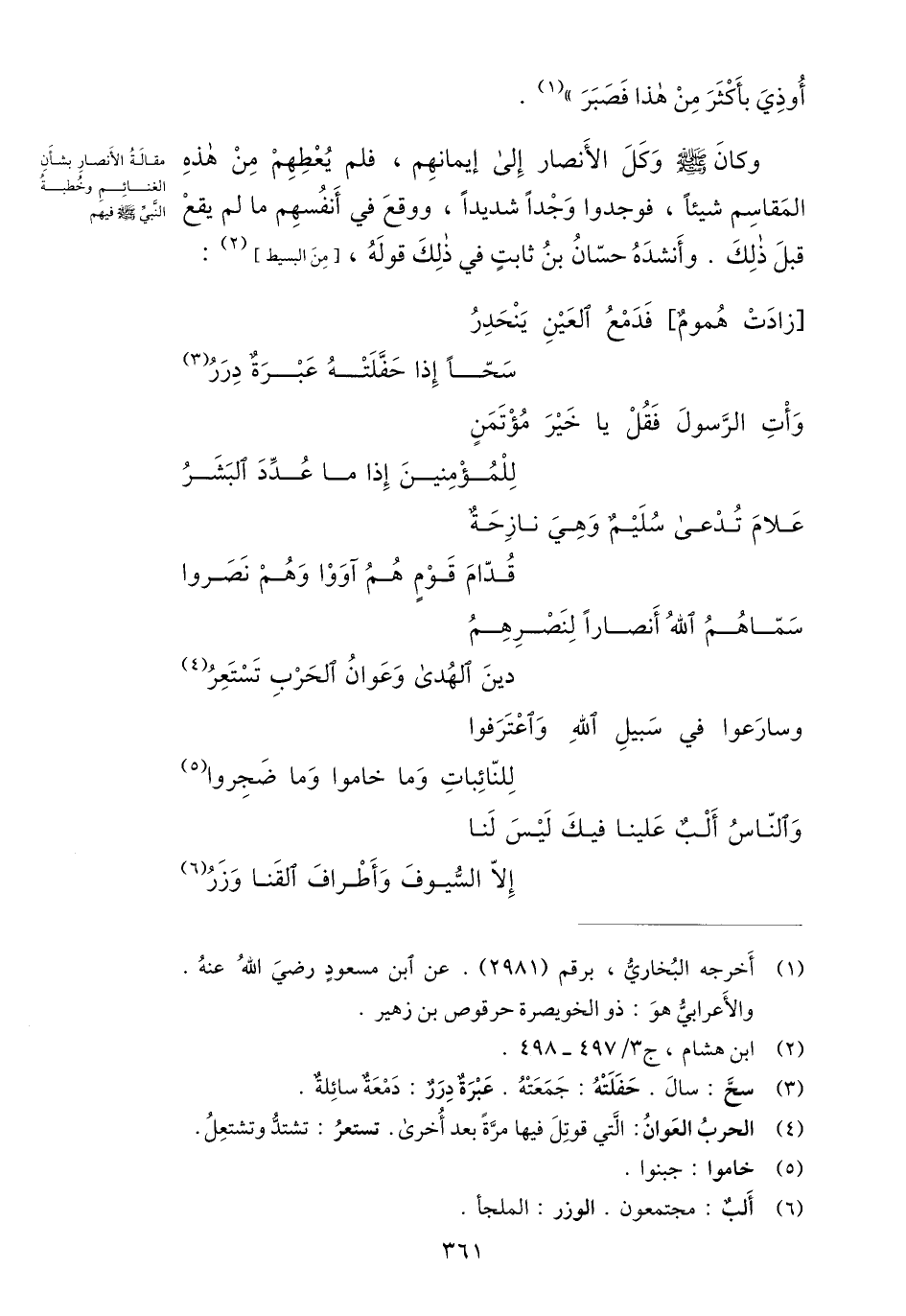 وكان صلى الله عليه وسلم وكل الأنصار إلى إيمانهم، فلم يعطهم من هذه المقاسم شيئا، فوجدوا وجدا شديدا، ووقع في أنفسهم ما لم يقع قبل ذلك. وأنشده حسّان بن ثابت في ذلك قوله، [من البسيط] «2» :