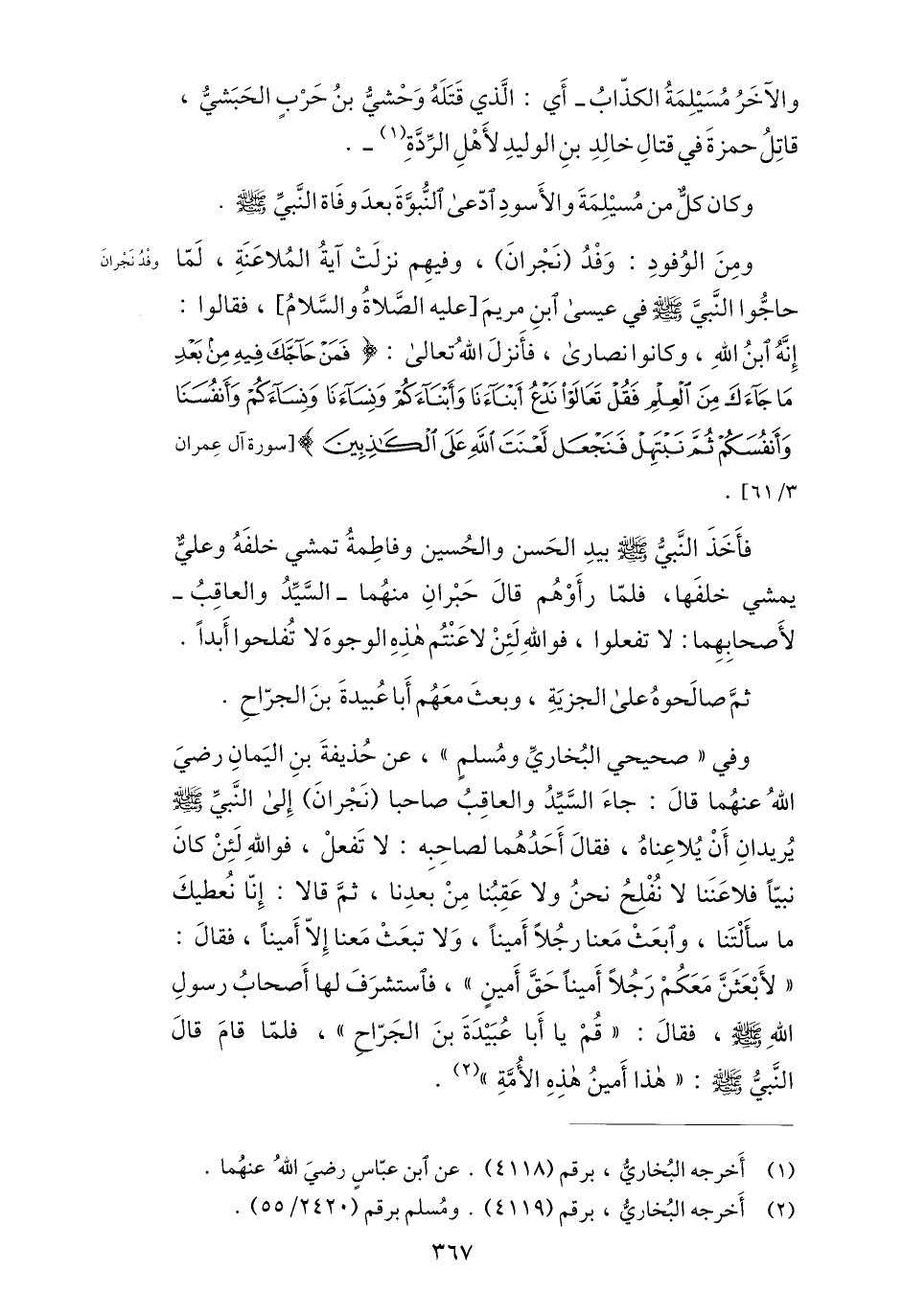 وفي «صحيحي البخاريّ ومسلم» ، عن حذيفة بن اليمان رضي الله عنهما قال: جاء السّيّد والعاقب صاحبا (نجران) إلى النّبيّ صلى الله عليه وسلم يريدان أن يلاعناه، فقال أحدهما لصاحبه: لا تفعل، فو الله لئن كان نبيّا فلاعننا لا نفلح نحن ولا عقبنا من بعدنا، ثمّ قالا: إنّا نعطيك ما سألتنا، وابعث معنا رجلا أمينا، ولا تبعث معنا إلّا أمينا، فقال: