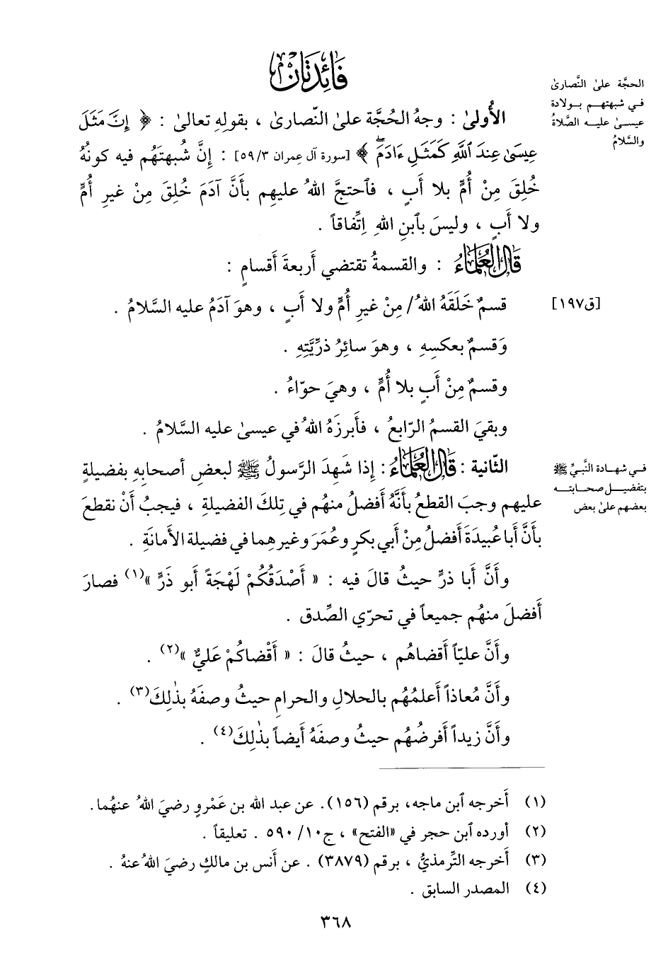 الأولى: [في الحجّة على النّصارى في شبهتهم بولادة عيسى عليه الصّلاة والسّلام]