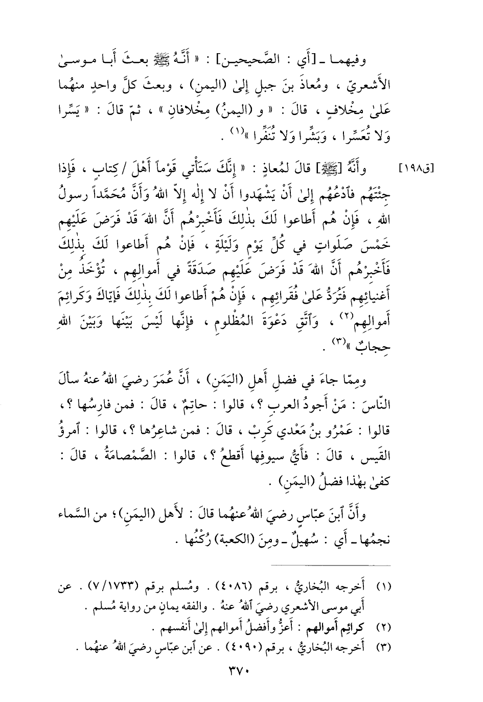 وأنّه [صلى الله عليه وسلم] قال لمعاذ: «إنّك ستأتي قوما أهل/ كتاب، فإذا جئتهم فادعهم إلى أن يشهدوا أن لا إله إلّا الله وأنّ محمّدا رسول الله، فإن هم أطاعوا لك بذلك فأخبرهم أنّ الله قد فرض عليهم خمس صلوات في كلّ يوم وليلة، فإن هم أطاعوا لك بذلك فأخبرهم أنّ الله قد فرض عليهم صدقة في أموالهم، تؤخذ من أغنيائهم فتردّ على فقرائهم، فإن هم أطاعوا لك بذلك فإيّاك وكرائم أموالهم «2» ، واتّق دعوة المظلوم، فإنّها ليس بينها وبين الله حجاب» «3» .