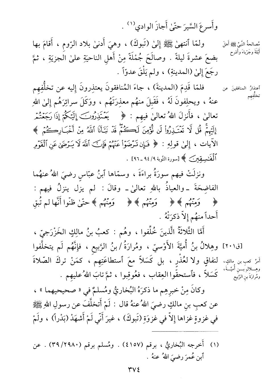 فلمّا قدم (المدينة) ، جاء المنافقون يعتذرون إليه عن تخلّفهم عنه، ويحلفون له، فقبل منهم معذرتهم، ووكل سرائرهم إلى الله تعالى، فأنزل الله تعالى فيهم: يَعْتَذِرُونَ إِلَيْكُمْ إِذا رَجَعْتُمْ إِلَيْهِمْ قُلْ لا تَعْتَذِرُوا لَنْ نُؤْمِنَ لَكُمْ قَدْ نَبَّأَنَا اللَّهُ مِنْ أَخْبارِكُمْ الآيات، إلى قوله: فَإِنْ تَرْضَوْا عَنْهُمْ فَإِنَّ اللَّهَ لا يَرْضى عَنِ الْقَوْمِ الْفاسِقِينَ [سورة التّوبة 9/ 94- 96] .