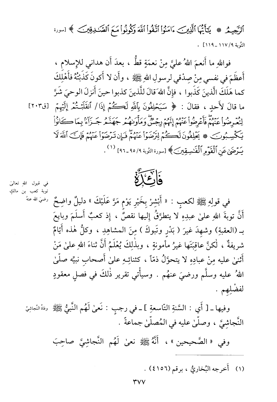 فو الله ما أنعم الله عليّ من نعمة قطّ، بعد أن هداني للإسلام، أعظم في نفسي من صدقي لرسول الله صلى الله عليه وسلم، وأن لا أكون كذبته فأهلك كما هلك الّذين كذبوا، فإنّ الله قال للّذين كذبوا حين أنزل الوحي شرّ ما قال لأحد، فقال: سَيَحْلِفُونَ بِاللَّهِ لَكُمْ إِذَا/ انْقَلَبْتُمْ إِلَيْهِمْ لِتُعْرِضُوا عَنْهُمْ فَأَعْرِضُوا عَنْهُمْ إِنَّهُمْ رِجْسٌ وَمَأْواهُمْ جَهَنَّمُ جَزاءً بِما كانُوا يَكْسِبُونَ. يَحْلِفُونَ لَكُمْ لِتَرْضَوْا عَنْهُمْ فَإِنْ تَرْضَوْا عَنْهُمْ فَإِنَّ اللَّهَ لا يَرْضى عَنِ الْقَوْمِ الْفاسِقِينَ [سورة التّوبة 9/ 95- 96] «1» .