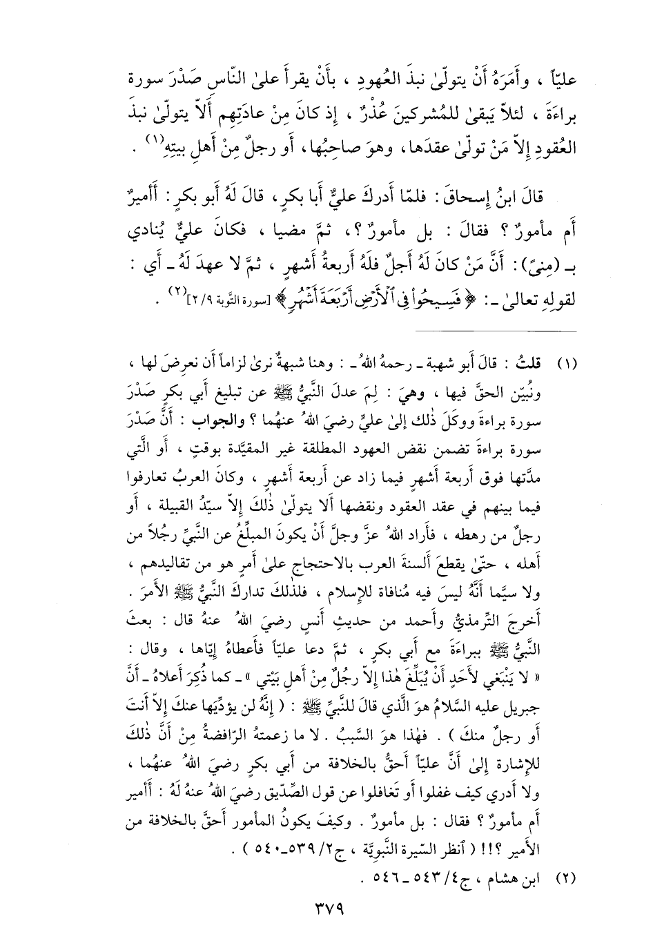 (1) قلت: قال أبو شهبة- رحمه الله-: وهنا شبهة نرى لزاما أن نعرض لها، ونبيّن الحقّ فيها، وهي: لم عدل النّبيّ صلى الله عليه وسلم عن تبليغ أبي بكر صدر سورة براءة ووكل ذلك إلى عليّ رضي الله عنهما؟ والجواب: أنّ صدر سورة براءة تضمن نقض العهود المطلقة غير المقيّدة بوقت، أو الّتي مدّتها فوق أربعة أشهر فيما زاد عن أربعة أشهر، وكان العرب تعارفوا فيما بينهم في عقد العقود ونقضها ألا يتولّى ذلك إلّا سيّد القبيلة، أو رجل من رهطه، فأراد الله عزّ وجلّ أن يكون المبلّغ عن النّبيّ صلى الله عليه وسلم رجلا من أهله، حتّى يقطع ألسنة العرب بالاحتجاج على أمر هو من تقاليدهم، ولا سيّما أنّه ليس فيه منافاة للإسلام، فلذلك تدارك النّبيّ صلى الله عليه وسلم الأمر. أخرج التّرمذيّ وأحمد من حديث أنس رضي الله عنه قال: بعث النّبيّ صلى الله عليه وسلم براءة مع أبي بكر، ثمّ دعا عليّا فأعطاه إيّاها، وقال: «لا ينبغي لأحد أن يبلّغ هذا إلّا رجل من أهل بيتي» - كما ذكر أعلاه- أنّ جبريل عليه السّلام هو الّذي قال للنّبيّ صلى الله عليه وسلم: (إنّه لن يؤدّيها عنك إلّا أنت أو رجل منك) . فهذا هو السّبب. لا ما زعمته الرّافضة من أنّ ذلك للإشارة إلى أنّ عليّا أحقّ بالخلافة من أبي بكر رضي الله عنهما، ولا أدري كيف غفلوا أو تغافلوا عن قول الصّدّيق رضي الله عنه له: أأمير أم مأمور؟ فقال: بل مأمور. وكيف يكون المأمور أحقّ بالخلافة من الأمير؟!! (انظر السّيرة النّبويّة، ج 2/ 539- 540) .
