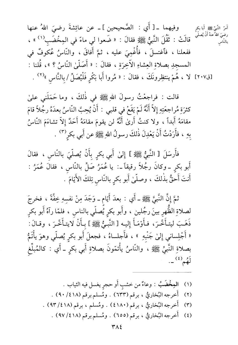 قالت: فراجعت رسول الله صلى الله عليه وسلم في ذلك، وما حملني على كثرة مراجعته إلّا أنّه لم يقع في قلبي: أن يحبّ النّاس بعده رجلا قام مقامه أبدا، ولا كنت أرى أنّه لن يقوم مقامه أحد إلّا تشاءم النّاس به، فأردت أن يعدل ذلك رسول الله صلى الله عليه وسلم عن أبي بكر «3» .