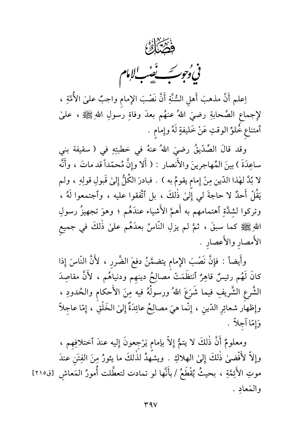 وقد قال الصّدّيق رضي الله عنه في خطبته في (سقيفة بني ساعدة) بين المهاجرين والأنصار: (ألا وإنّ محمّدا قد مات، وأنّه لا بدّ لهذا الدّين من إمام يقوم به) . فبادر الكلّ إلى قبول قوله، ولم يقل أحد لا حاجة لي إلى ذلك، بل اتّفقوا عليه، واجتمعوا له، وتركوا لشدّة اهتمامهم به أهمّ الأشياء عندهم؛ وهو تجهيز رسول الله صلى الله عليه وسلم كما سبق، ثمّ لم يزل النّاس بعدهم على ذلك في جميع الأمصار والأعصار.