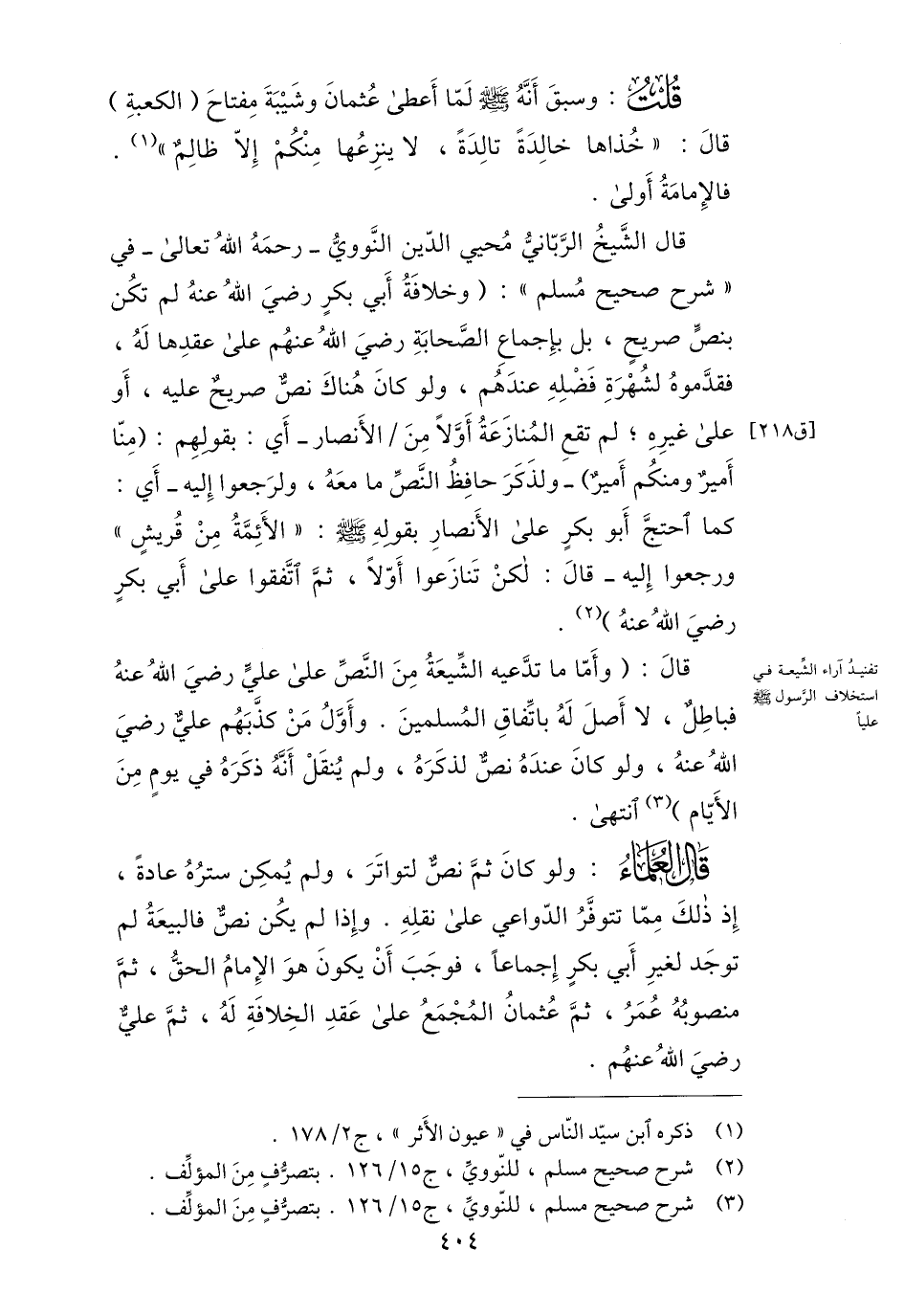 قال: (وأمّا ما تدّعيه الشّيعة من النّصّ على عليّ رضي الله عنه فباطل، لا أصل له باتّفاق المسلمين. وأوّل من كذّبهم عليّ رضي الله عنه، ولو كان عنده نصّ لذكره، ولم ينقل أنّه ذكره في يوم من الأيّام) «3» انتهى.