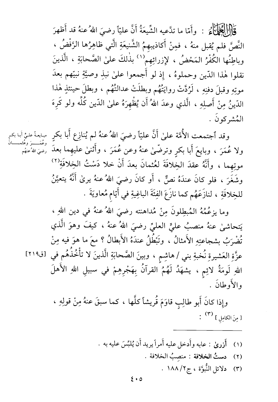 قال العلماء: وأمّا ما تدّعيه الشّيعة أنّ عليّا رضي الله عنه قد أظهر النّصّ فلم يقبل منه، فمن أكاذيبهم الشّنيعة الّتي ظاهرها الرّفض، وباطنها الكفر المحض، لإزرائهم «1» بذلك على الصّحابة، الّذين نقلوا هذا الدّين وحملوه، إذ لو أجمعوا على نبذ وصيّة نبيّهم بعد موته وقبل دفنه، لردّت روايتهم وبطلت عدالتهم، وبطل حينئذ هذا الدّين من أصله، الّذي وعد الله أن يظهره على الدّين كلّه ولو كره المشركون.
