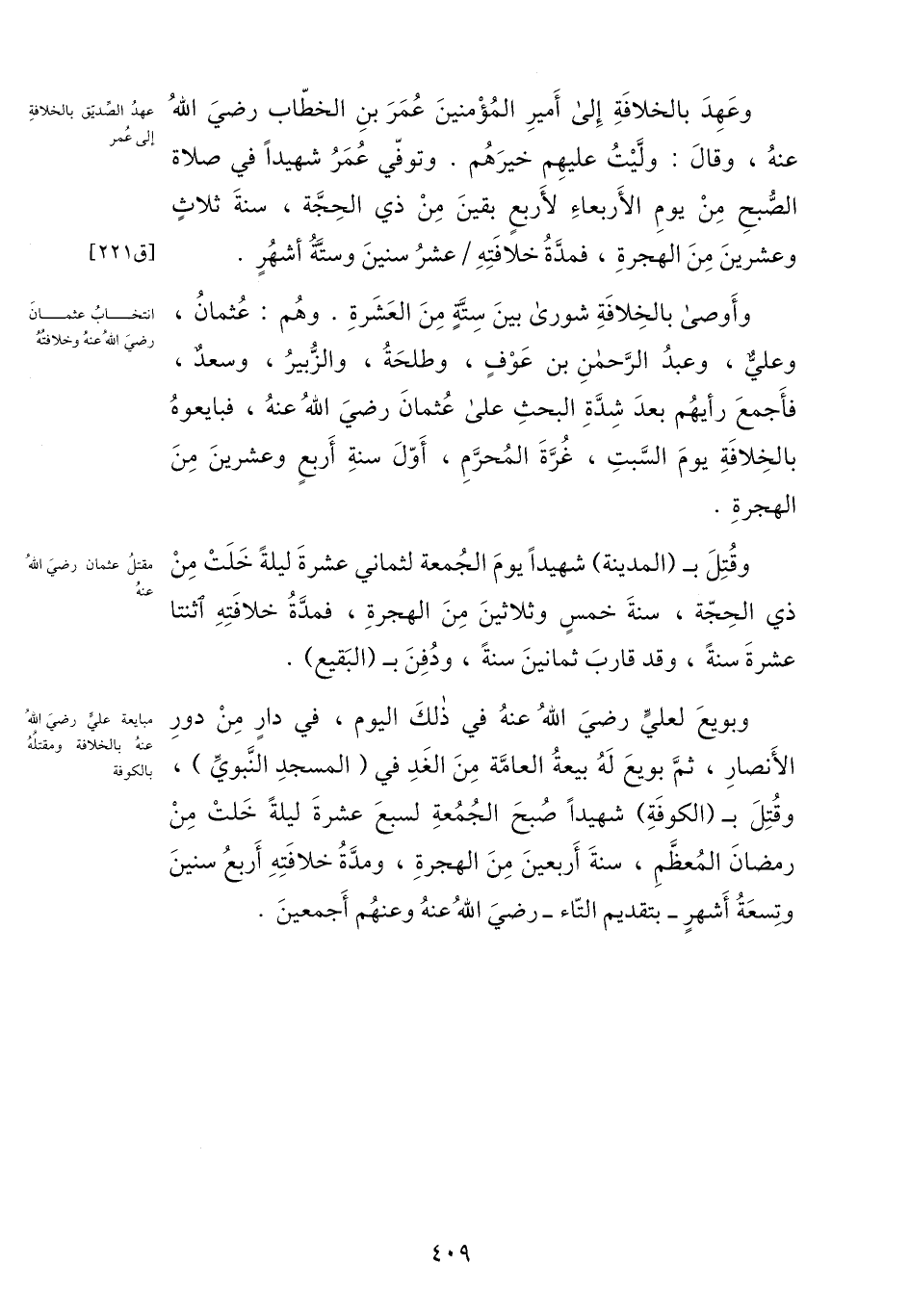 وبويع لعليّ رضي الله عنه في ذلك اليوم، في دار من دور الأنصار، ثمّ بويع له البيعة العامّة من الغد في (المسجد النّبويّ) ، وقتل ب (الكوفة) شهيدا صبح الجمعة لسبع عشرة ليلة خلت من رمضان المعظّم، سنة أربعين من الهجرة، ومدّة خلافته أربع سنين وتسعة أشهر- بتقديم التّاء- رضي الله عنه وعنهم أجمعين.