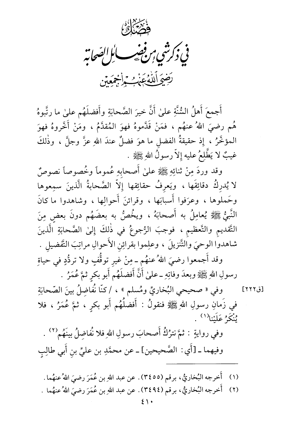 وقد ورد من ثنائه صلى الله عليه وسلم على أصحابه عموما وخصوصا نصوص لا يدرك دقائقها، ويعرف حقائقها إلّا الصّحابة الّذين سمعوها وحملوها، وعرفوا أسبابها، وقرائن أحوالها، وشاهدوا ما كان النّبيّ صلى الله عليه وسلم يعامل به أصحابه، ويخصّ به بعضهم دون بعض من التّقديم والتّعظيم، فوجب الرّجوع في ذلك إلى الصّحابة الّذين شاهدوا الوحي والتّنزيل، وعلموا بقرائن الأحوال مراتب التّفضيل.