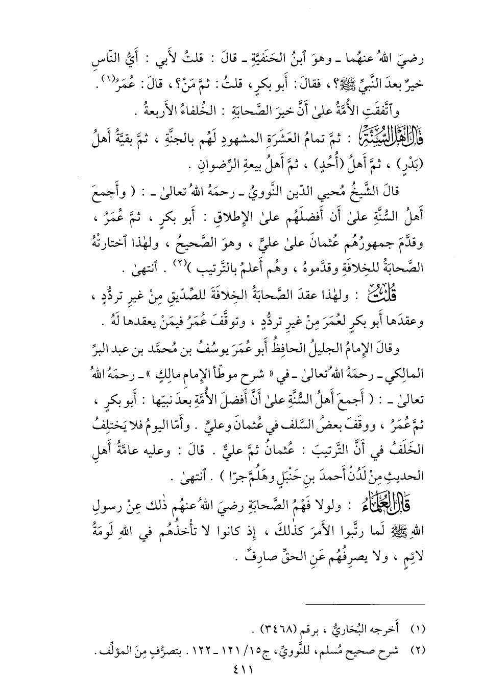 وقال الإمام الجليل الحافظ أبو عمر يوسف بن محمّد بن عبد البرّ المالكي- رحمه الله تعالى- في «شرح موطّأ الإمام مالك» - رحمه الله تعالى-: (أجمع أهل السّنّة على أنّ أفضل الأمّة بعد نبيّها: أبو بكر، ثمّ عمر، ووقف بعض السّلف في عثمان وعليّ. وأمّا اليوم فلا يختلف الخلف في أنّ التّرتيب: عثمان ثمّ عليّ. قال: وعليه عامّة أهل الحديث من لدن أحمد ابن حنبل وهلمّ جرّا) . انتهى.