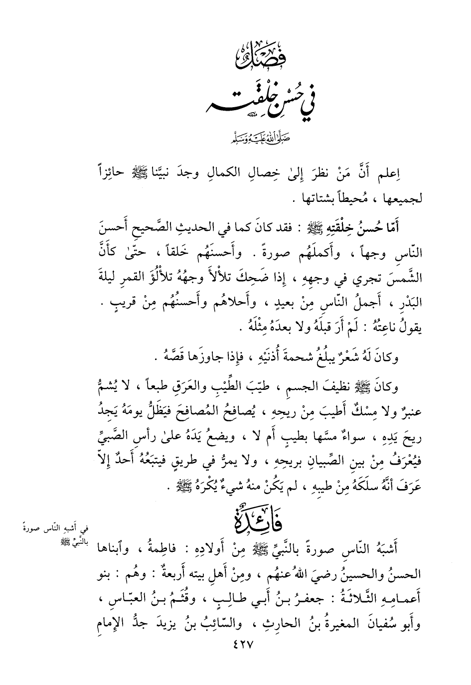 إعلم أنّ من نظر إلى خصال الكمال وجد نبيّنا صلى الله عليه وسلم حائزا لجميعها، محيطا بشتاتها.