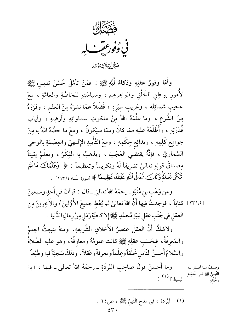 وأمّا وفور عقله وذكاء لبّه صلى الله عليه وسلم: فمن تأمّل حسن تدبيره صلى الله عليه وسلم لأمور بواطن الخلق وظواهرهم، وسياسته للخاصّة والعامّة، مع عجيب شمائله، وغريب سيره، فضلا عمّا نشره من العلم، وقرّره من الشّرع، وما علّمه الله من ملكوت سماواته وأرضه، وآيات قدرته، وأطلعه عليه ممّا كان وممّا سيكون، ومع ما خصّه الله به من جوامع كلمه، وبدائع حكمه، ومع التّأييد الإلهيّ والعصمة بالوحي السّماويّ، فإنّه يقتضي العجب، ويذهب به الفكر، ويعلم يقينا مصداق قوله تعالى تشريفا له وتكريما وتعظيما: وَعَلَّمَكَ ما لَمْ تَكُنْ تَعْلَمُ وَكانَ فَضْلُ اللَّهِ عَلَيْكَ عَظِيماً