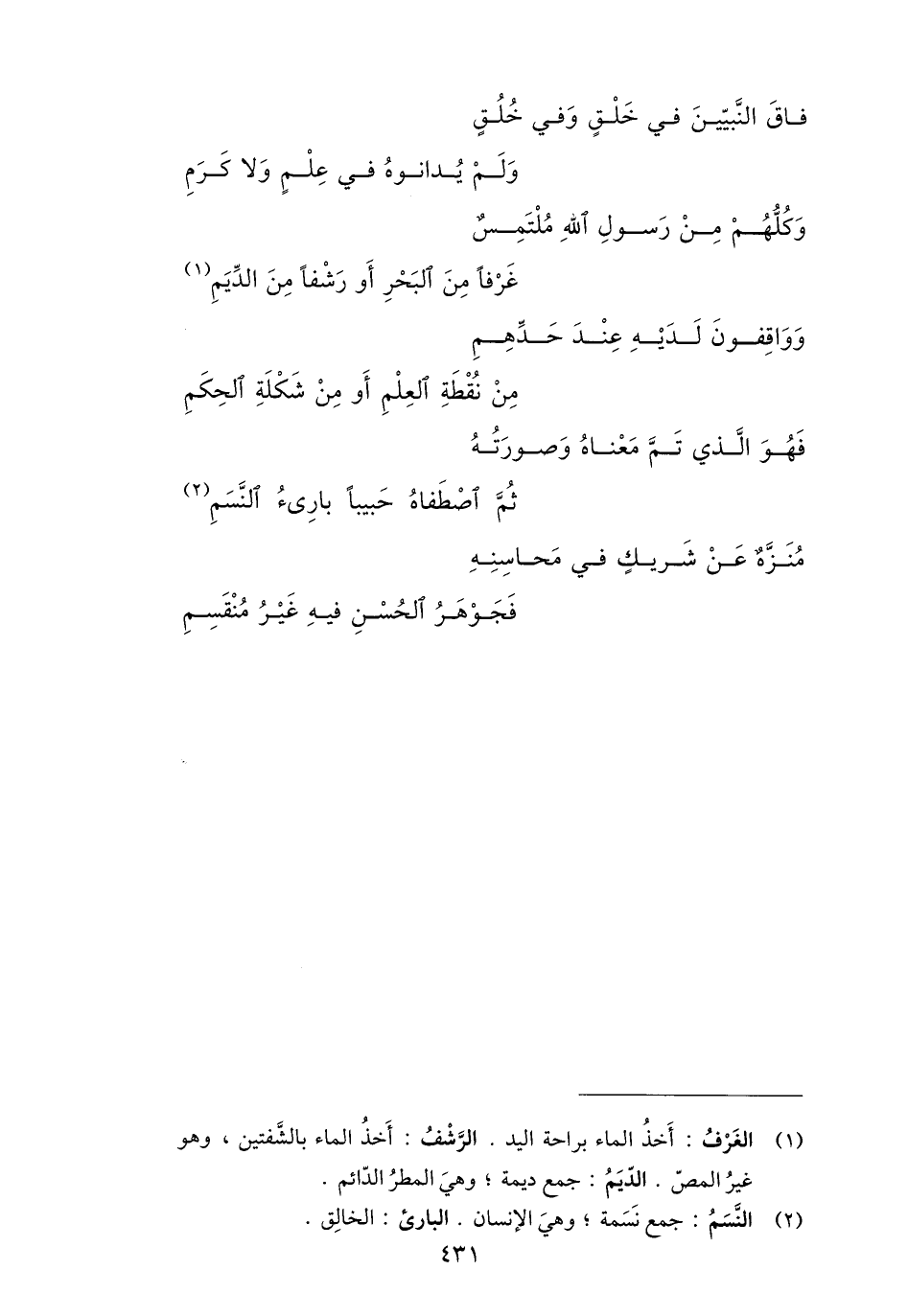 وكلّهم من رسول الله ملتمس ... غرفا من البحر أو رشفا من الدّيم «1»