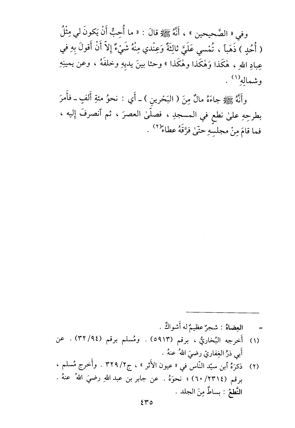 (2) ذكره ابن سيّد النّاس في «عيون الأثر» ، ج 2/ 329. وأخرج مسلم، برقم (2314/ 60) ؛ نحوه. عن جابر بن عبد الله رضي الله عنهما. النّطع: بساط من الجلد.