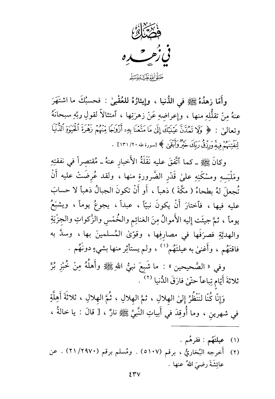 وأمّا زهده صلى الله عليه وسلم في الدّنيا، وإيثاره للعقبى: فحسبك ما اشتهر عنه من تقلّله منها، وإعراضه عن زهرتها، امتثالا لقول ربّه سبحانه وتعالى: وَلا تَمُدَّنَّ عَيْنَيْكَ إِلى ما مَتَّعْنا بِهِ أَزْواجاً مِنْهُمْ زَهْرَةَ الْحَياةِ الدُّنْيا لِنَفْتِنَهُمْ فِيهِ وَرِزْقُ رَبِّكَ خَيْرٌ وَأَبْقى [سورة طه 20/ 131] .