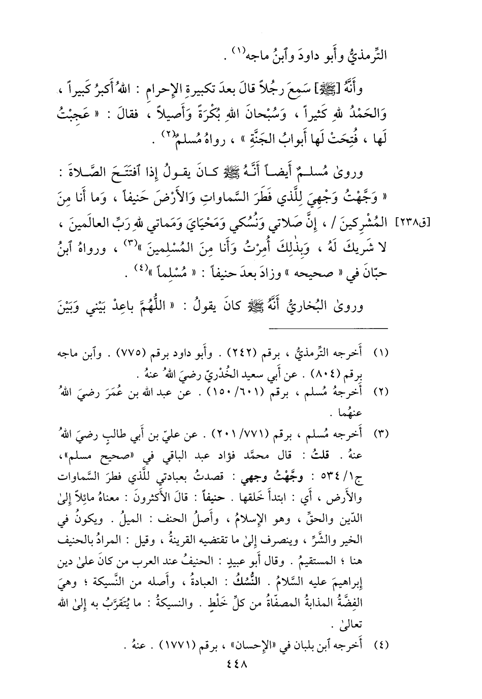 (3) أخرجه مسلم، برقم (771/ 201) . عن عليّ بن أبي طالب رضي الله عنه. قلت: قال محمّد فؤاد عبد الباقي في «صحيح مسلم» ، ج 1/ 534: وجّهت وجهي: قصدت بعبادتي للّذي فطر السّماوات والأرض، أي: ابتدأ خلقها. حنيفا: قال الأكثرون: معناه مائلا إلى الدّين والحقّ، وهو الإسلام، وأصل الحنف: الميل. ويكون في الخير والشّرّ، وينصرف إلى ما تقتضيه القرينة، وقيل: المراد بالحنيف هنا؛ المستقيم. وقال أبو عبيد: الحنيف عند العرب من كان على دين إبراهيم عليه السّلام. النّسك: العبادة، وأصله من النّسيكة؛ وهي الفضّة المذابة المصفّاة من كلّ خلط. والنسيكة: ما يتقرّب به إلى الله تعالى.