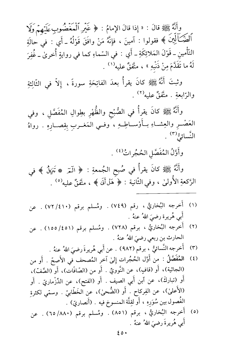 وأنّه صلى الله عليه وسلم كان يقرأ في صبح الجمعة: الم. تَنْزِيلُ في الرّكعة الأولى، وفي الثّانية: هَلْ أَتى، متّفق عليه «5» .