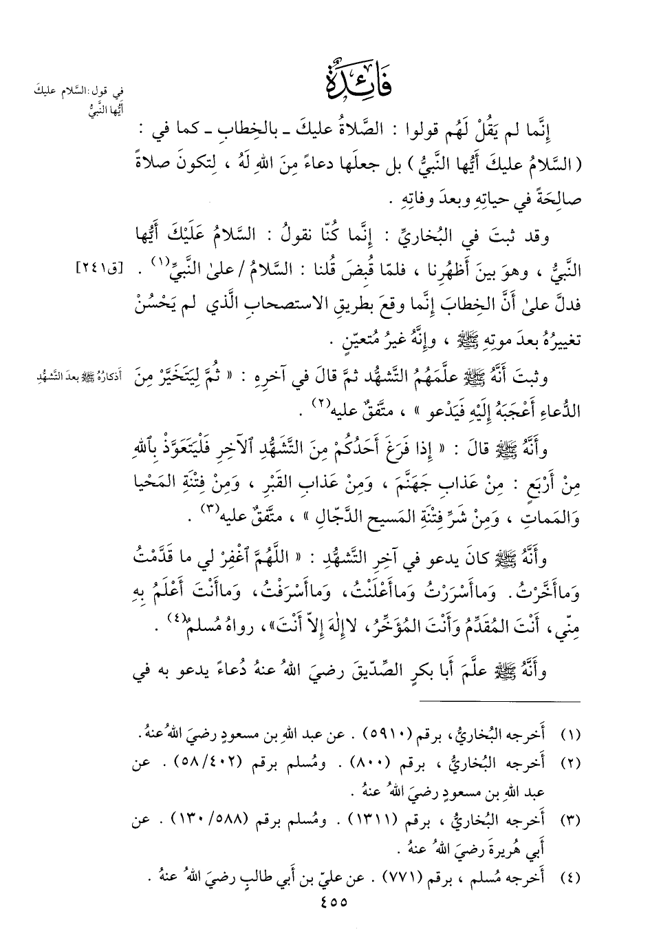 وقد ثبت في البخاريّ: إنّما كنّا نقول: السّلام عليك أيّها النّبيّ، وهو بين أظهرنا، فلمّا قبض قلنا: السّلام/ على النّبيّ «1» .