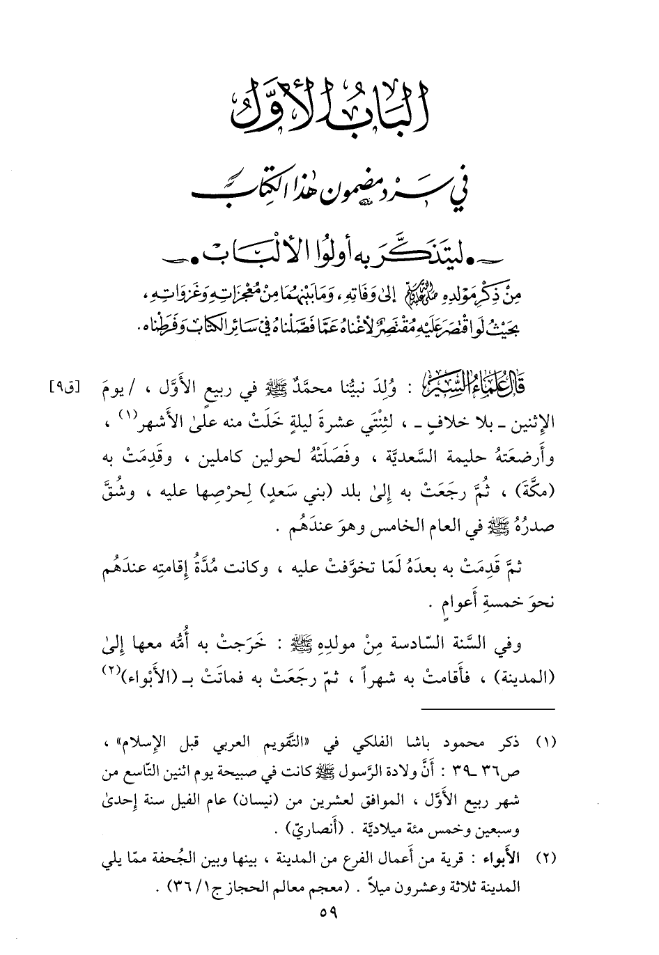 (1) ذكر محمود باشا الفلكي في «التّقويم العربي قبل الإسلام» ، ص 36- 39: أنّ ولادة الرّسول صلى الله عليه وسلم كانت في صبيحة يوم اثنين التّاسع من شهر ربيع الأوّل، الموافق لعشرين من (نيسان) عام الفيل سنة إحدى وسبعين وخمس مئة ميلاديّة. (أنصاريّ) .