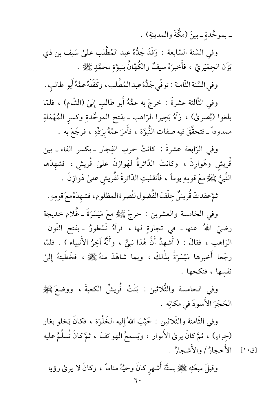 وفي الثّامنة والثّلاثين: حبّب الله إليه الخلوة، فكان يخلو بغار (حراء) ، ثمّ كان يرى الأنوار، ويسمع الهواتف، ثمّ كان تسلّم عليه الأحجار/ والأشجار.