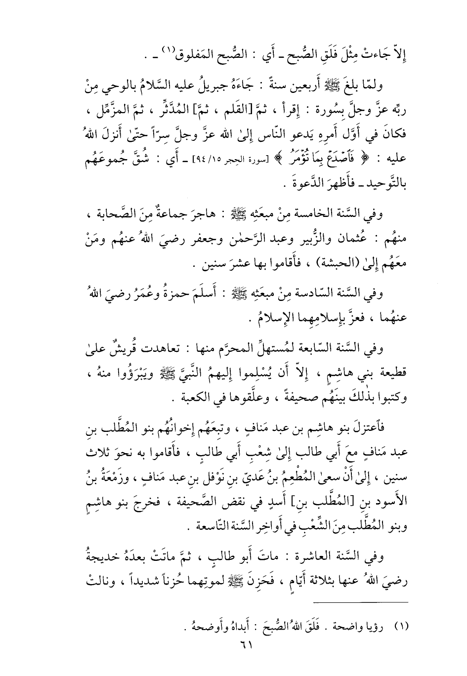ولمّا بلغ صلى الله عليه وسلم أربعين سنة: جاءه جبريل عليه السّلام بالوحي من ربّه عزّ وجلّ بسورة: اقرأ، ثمّ [القلم، ثمّ] المدّثّر، ثمّ المزّمّل، فكان في أوّل أمره يدعو النّاس إلى الله عزّ وجلّ سرّا حتّى أنزل الله عليه: فَاصْدَعْ بِما تُؤْمَرُ [سورة الحجر 15/ 94]- أي: شقّ جموعهم بالتّوحيد- فأظهر الدّعوة.