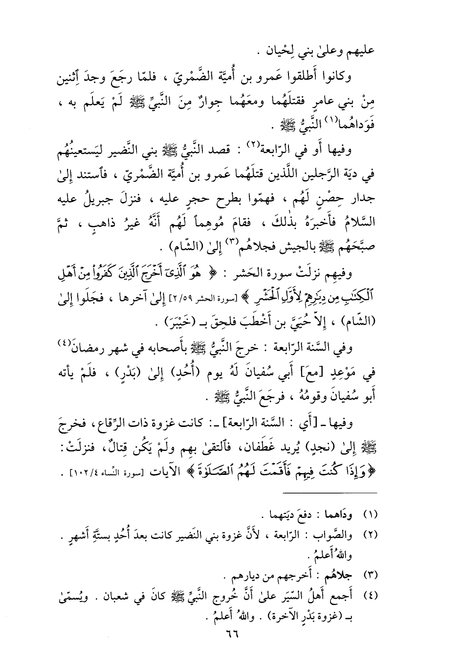 وفيها أو في الرّابعة «2» : قصد النّبيّ صلى الله عليه وسلم بني النّضير ليستعينهم في دية الرّجلين اللّذين قتلهما عمرو بن أميّة الضّمريّ، فاستند إلى جدار حصن لهم، فهمّوا بطرح حجر عليه، فنزل جبريل عليه السّلام فأخبره بذلك، فقام موهما لهم أنّه غير ذاهب، ثمّ صبّحهم صلى الله عليه وسلم بالجيش فجلاهم «3» إلى (الشّام) .
