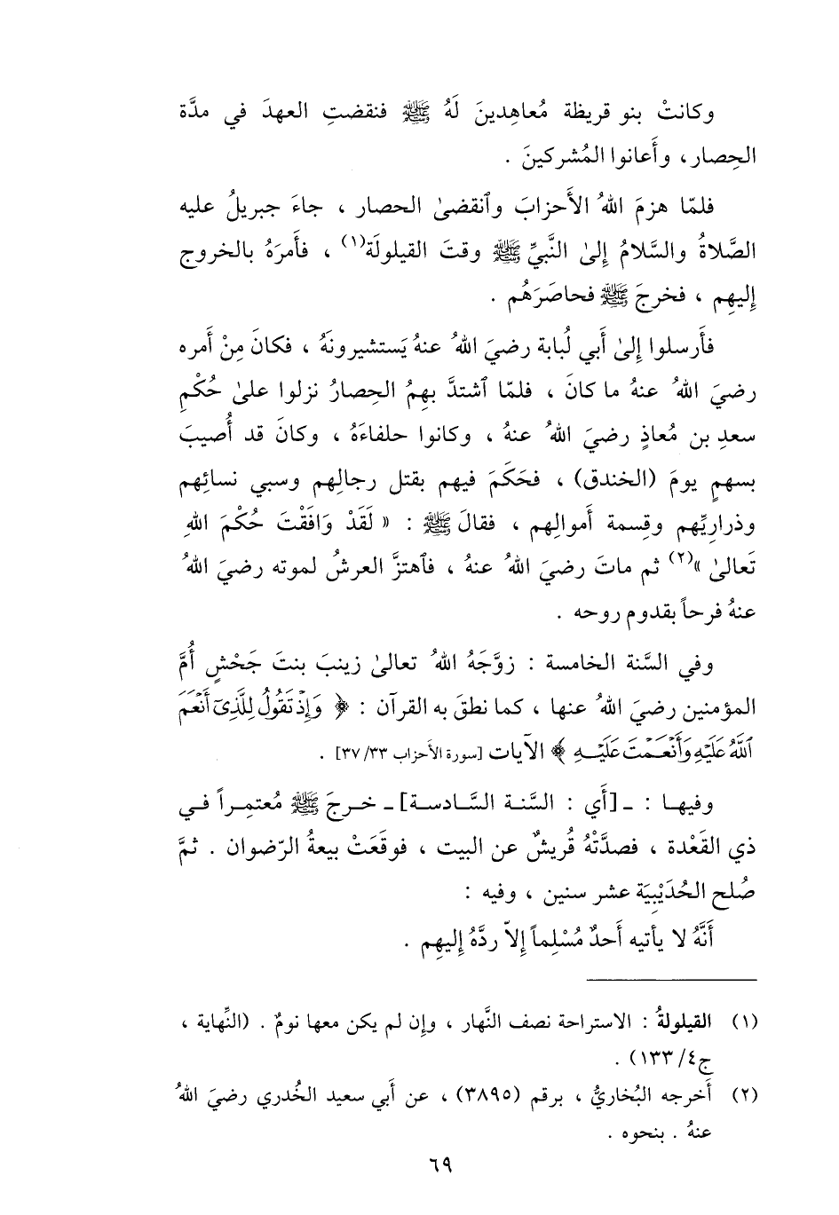وفيها: -[أي: السّنة السّادسة]- خرج صلى الله عليه وسلم معتمرا في ذي القعدة، فصدّته قريش عن البيت، فوقعت بيعة الرّضوان. ثمّ صلح الحديبية عشر سنين، وفيه: