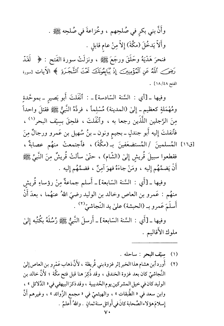 وفيها-[أي: السّنة السّابعة]- أسلم جماعة من رؤساء قريش منهم: عمرو بن العاص وخالد بن الوليد رضي الله عنهما، بعد أن أسلم عمرو ب (الحبشة) على يد النّجاشيّ «2» .