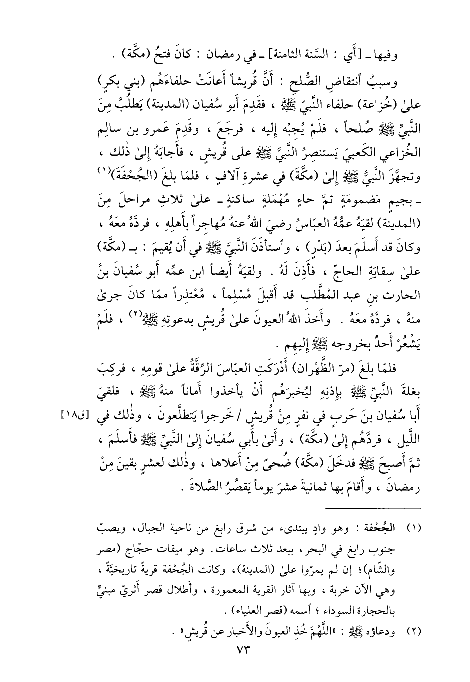 فلمّا بلغ (مرّ الظّهران) أدركت العبّاس الرّقّة على قومه، فركب بغلة النّبيّ صلى الله عليه وسلم بإذنه ليخبرهم أن يأخذوا أمانا منه صلى الله عليه وسلم، فلقي أبا سفيان بن حرب في نفر من قريش/ خرجوا يتطلّعون، وذلك في اللّيل، فردّهم إلى (مكّة) ، وأتى بأبي سفيان إلى النّبيّ صلى الله عليه وسلم فأسلم، ثمّ أصبح صلى الله عليه وسلم فدخل (مكّة) ضحى من أعلاها، وذلك لعشر بقين من رمضان، وأقام بها ثمانية عشر يوما يقصر الصّلاة.