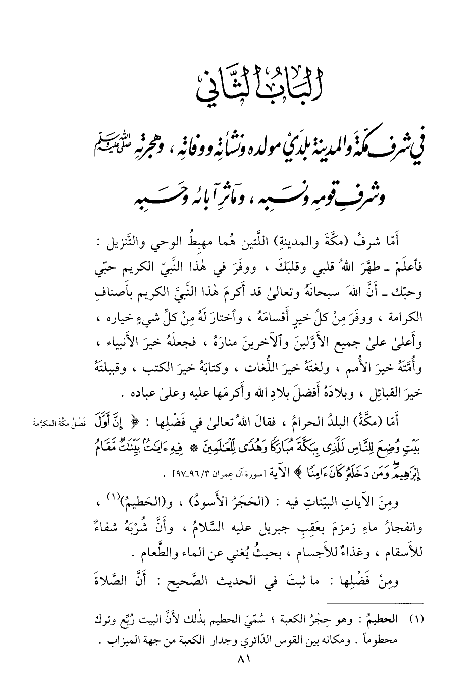 الباب الثّاني في شرف مكّة والمدينة بلدي مولده ونشاته ووفاته، وهجرته صلى الله عليه وسلم وشرف قومه ونسبه، وماثر آبائه وحسبه