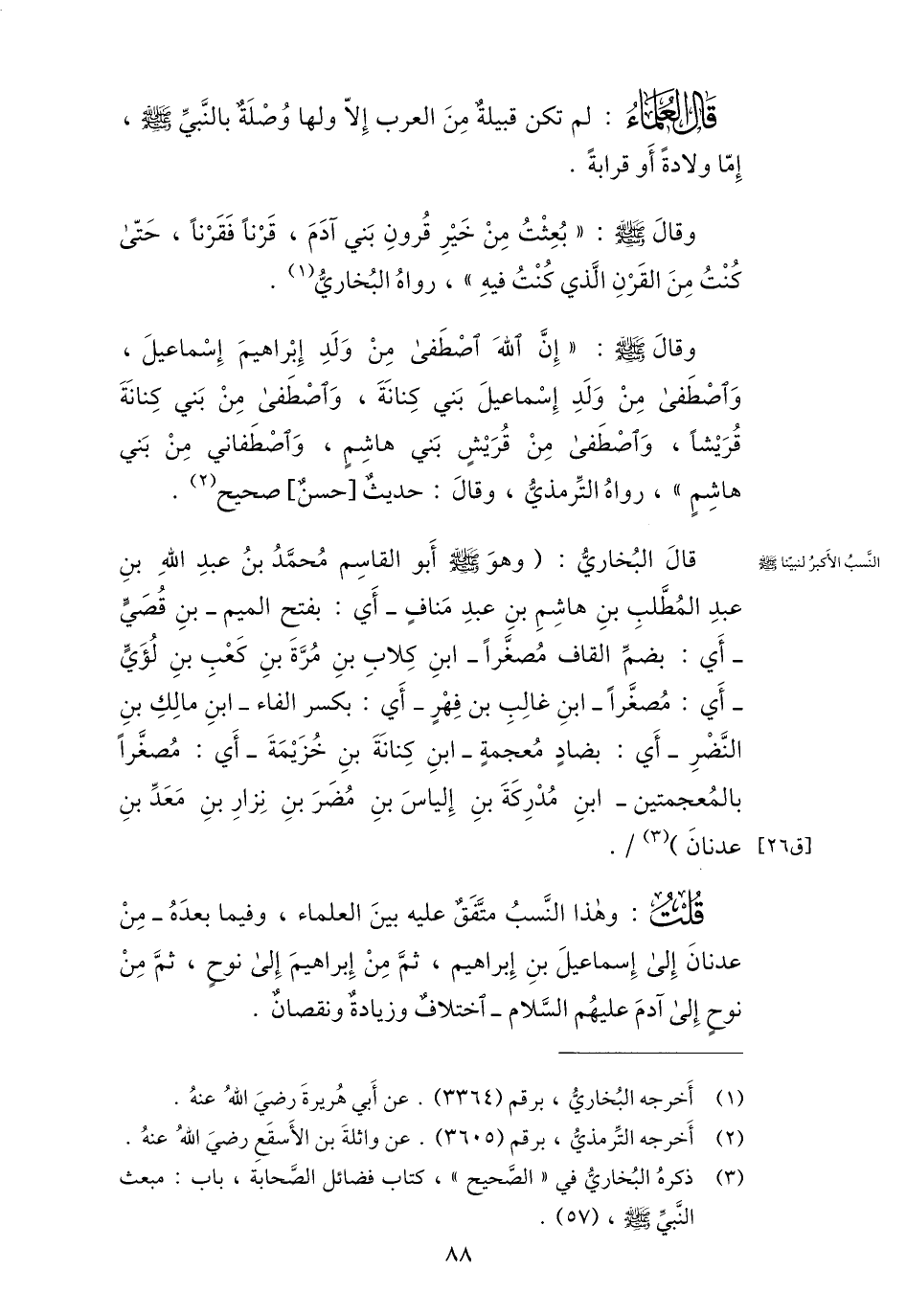 قلت: وهذا النّسب متّفق عليه بين العلماء، وفيما بعده- من عدنان إلى إسماعيل بن إبراهيم، ثمّ من إبراهيم إلى نوح، ثمّ من نوح إلى آدم عليهم السّلام- اختلاف وزيادة ونقصان.